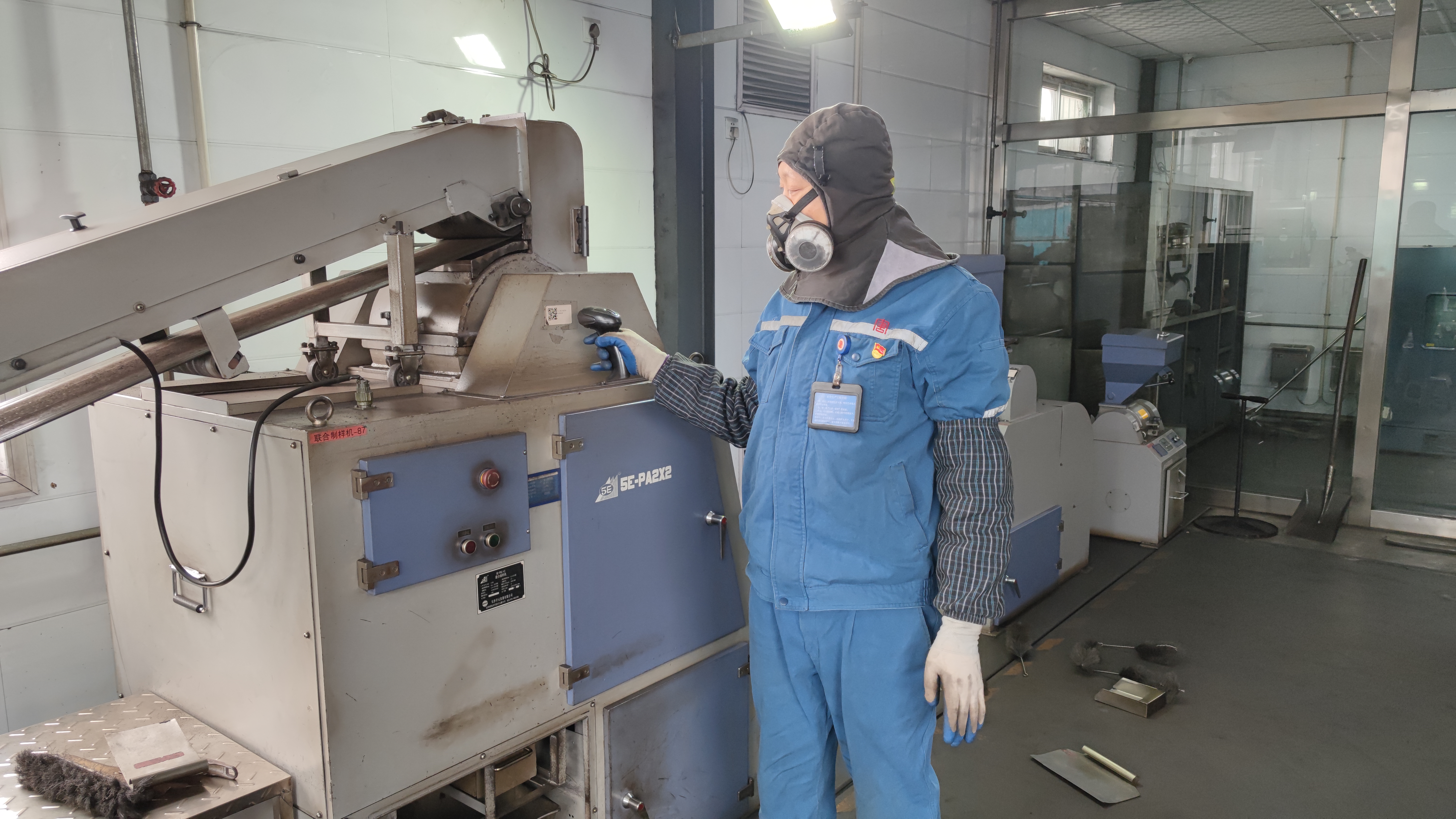制样间的小小空间里,一道忙碌的身影来回穿梭,在霍刚手里,一个个煤样通过过筛、破碎、缩分,最后堆成了粉样。挺拔的身躯、矫健的步伐、熟悉的操作,不由令人肃然起敬。定睛细看,在他沾满煤粉、微微泛白的蓝色工服下,面孔被防尘口罩遮住,在防尘帽、手套的“武装”下,俨然一副“战士”模样。即便如此,还是能让人一眼就认出来,他便是班里的老大哥——霍刚。