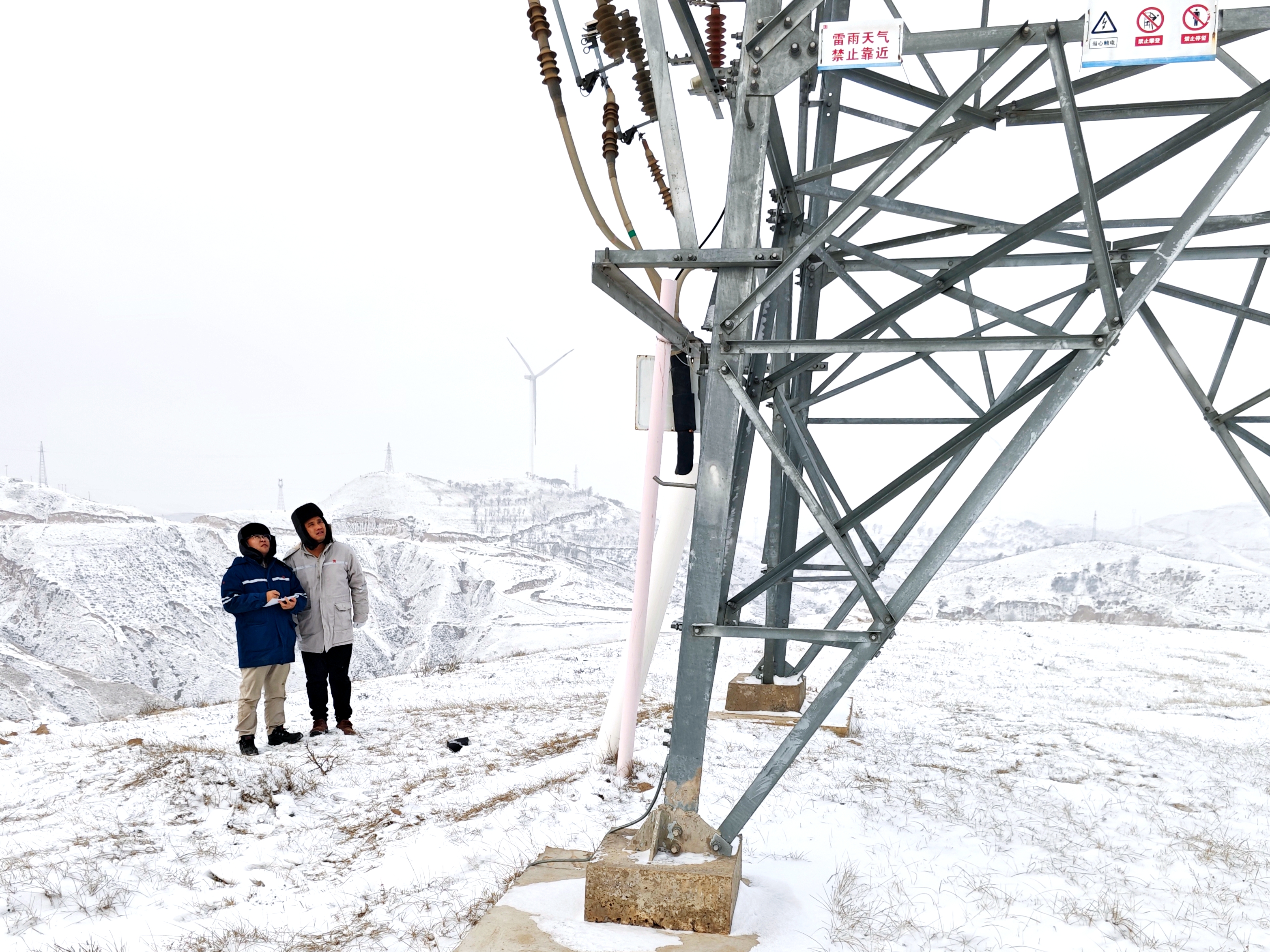 除夕清晨,阳光还未完全驱散冬日的寒意,上郡区域运维中心油房庄风电场一片白茫茫。伴随着踩积雪“咯吱咯吱”的声音,他们便早早地为场站贴上了春联和福字,为变电站“守岁”。“今天任务比较重,要巡的是集电2A3线和2A4线,我们要打起精神。”班长李鹏飞对同事卫哲边说边开始换装,背起工具包,拿着望远镜出发。